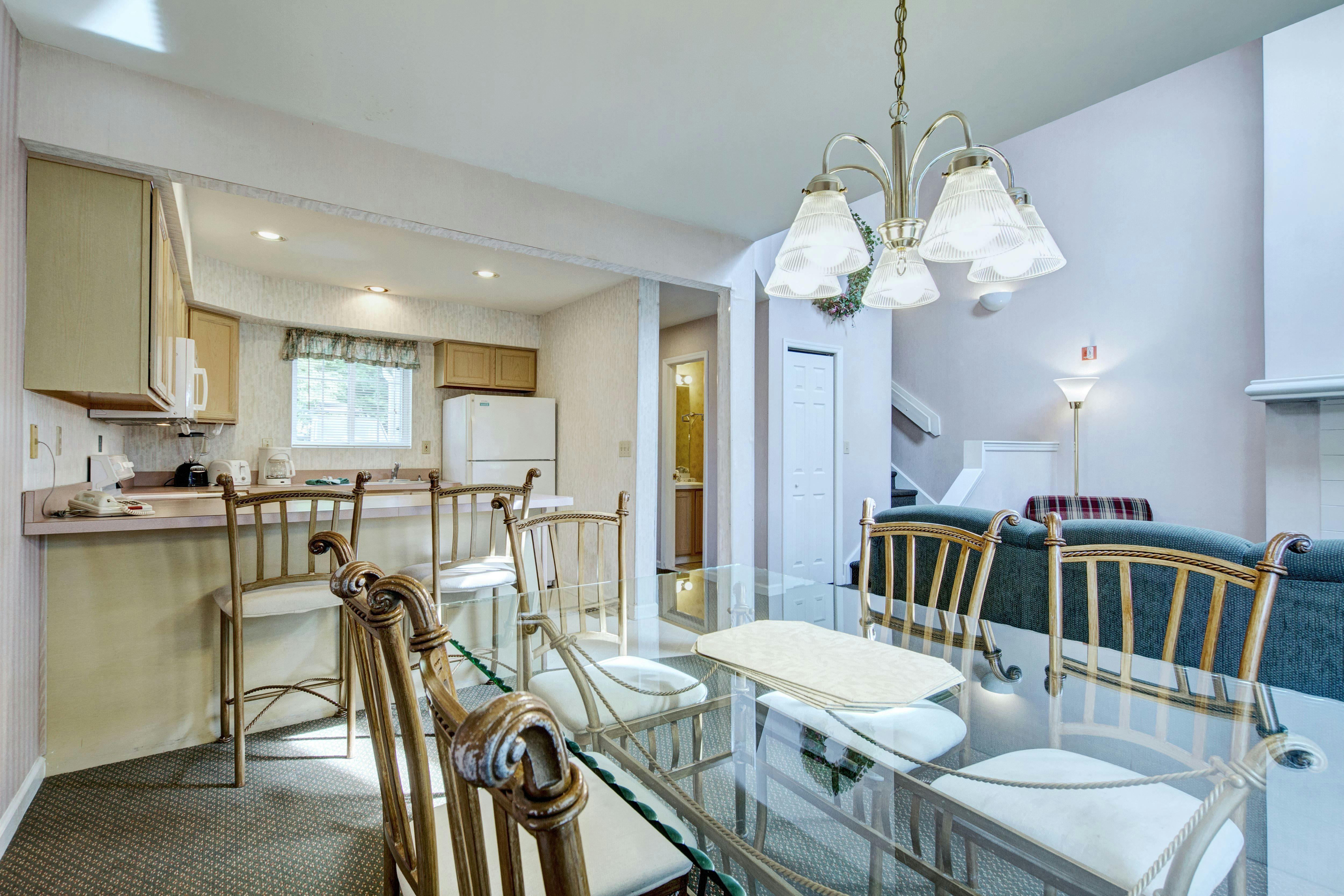 At Pocono Mountain Villas, our 1-Bedroom Villa Treetops offers a comfortable living space for up to 4 guests with 1-Queen Bed and 1-Sofa Sleeper plus a full kitchen, dining area, and large flat-screen television. Room configurations and furnishings may vary.
