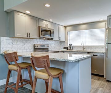 At Pocono Mountain Villas, our 2-Bedroom Loft Treetops offers a comfortable living space for up to 6 guests with 1-Queen Bed in the master bedroom, 1-Queen Bed in the secondary bedroom, 2-Twin Beds in the loft, 1-Sofa Sleeper, and 2 bathrooms. Plus, a full kitchen, dining area, washer & dryer, and a large flat screen television. Room configurations and furnishings may vary.