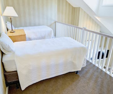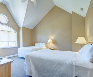 At Pocono Mountain Villas, our 3-Bedroom Deluxe offers a comfortable living space for up to 10 guests with 1-Queen Bed in the master bedroom, 2-Queen Beds in the secondary bedroom, 2-Twin Beds in the third bedroom, 1-Sofa Sleeper, and 2.5 bathrooms. Plus, a full kitchen, dining area, and a large flat screen television. Room configurations and furnishings may vary.